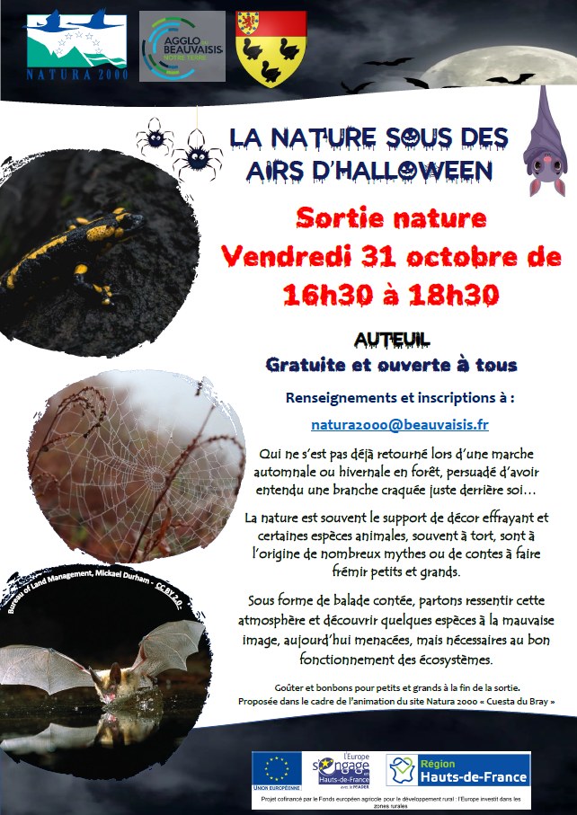Dans le cadre de l'animation du site Natura 2000 "Cuesta du Bray", la communauté d'agglomération du Beauvaisis et la commune d'Auteuil propose une sortie nature sur le thème d'Halloween, le 31 octobre de 16h30 à 18h30.