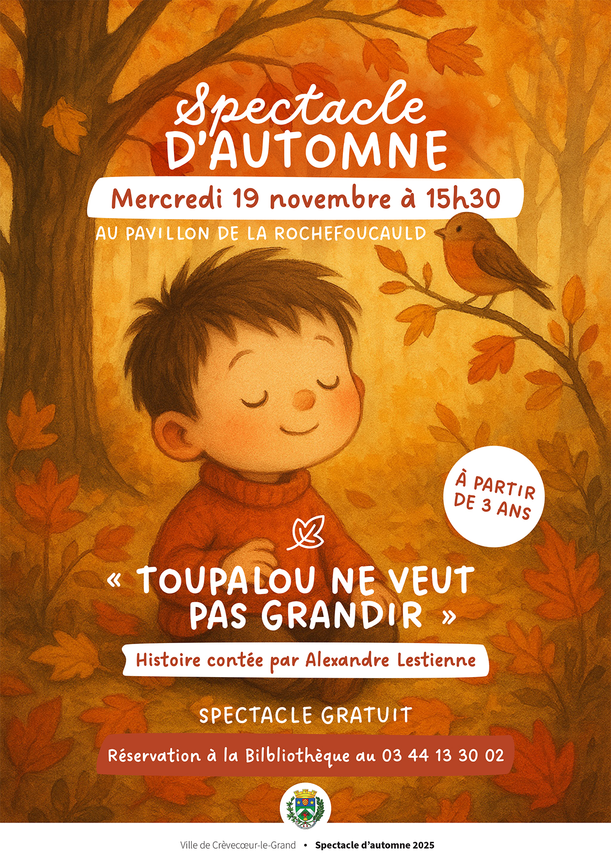 La Ville de Crèvecœur-le-Grand invite les petits (et les grands !) à un moment plein de douceur et de poésie. Laissez-vous emporter par l’histoire de Toupalou, contée avec tendresse par Alexandre Lestienne. Un spectacle qui célèbre l’enfance, les émotions et la beauté des saisons.
