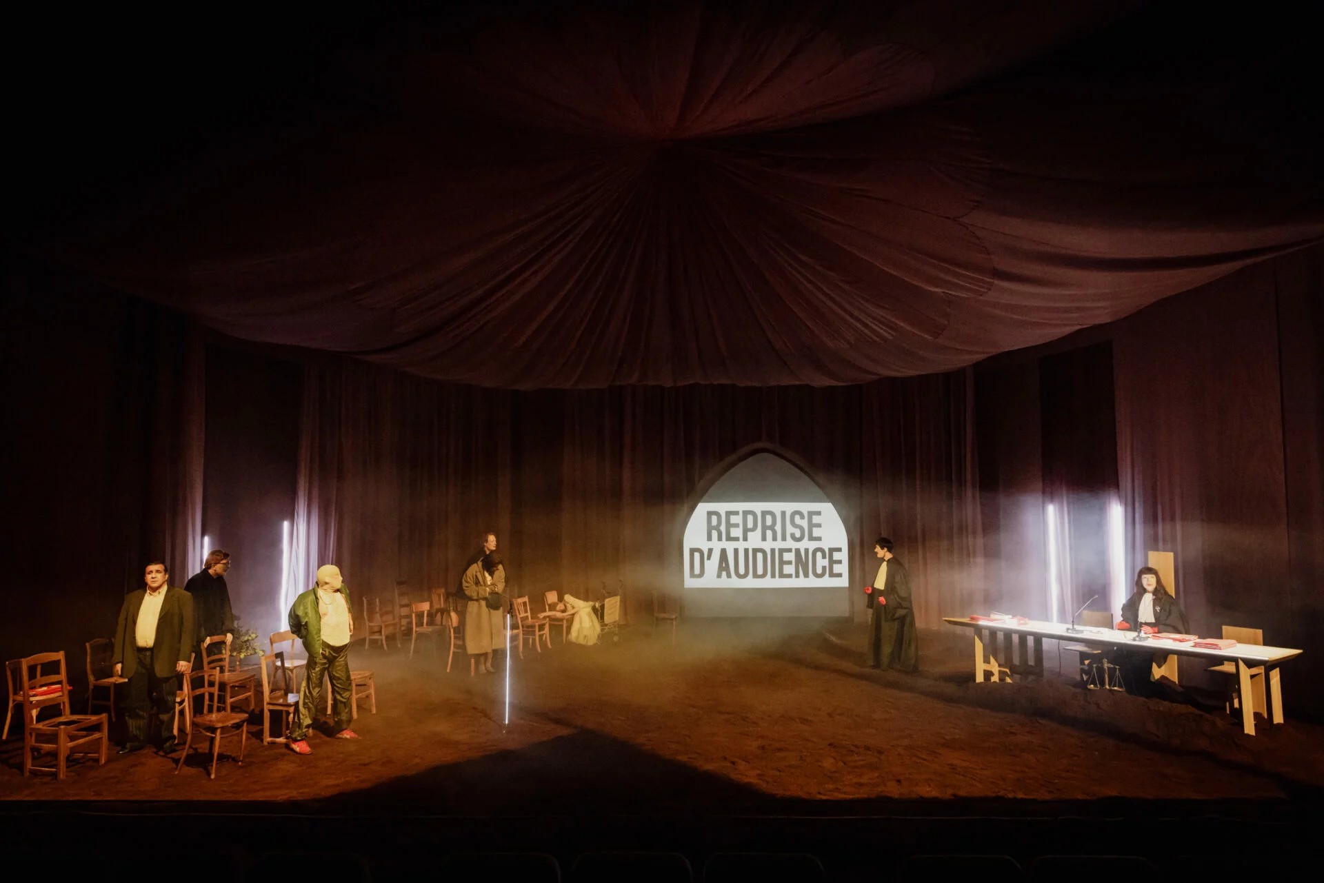 Sur scène, sous un chapiteau qui déplace l’idée du tribunal, Lorraine de Sagazan imagine un contre-espace et tente de renverser certaines évidences. En toile de fond de ce spectacle proposé par Lorraine de Sagazan et sa compagnie, une interrogation sur les mécanismes de la justice institutionnelle. La metteuse en scène et son dramaturge sont partis du constat que très souvent la justice ne dispose pas face à face un coupable et sa victime, mais un coupable et la société, dans l’incarnation du procureur de la République. Dès lors, une personne n’est pas jugée en fonction de la réalité des faits commis à l’encontre d’une autre personne, mais en fonction d’un ordre, ou de la représentation que l’on s’en fait. Et ce notamment dans les procédures d’urgence, de comparution immédiate.