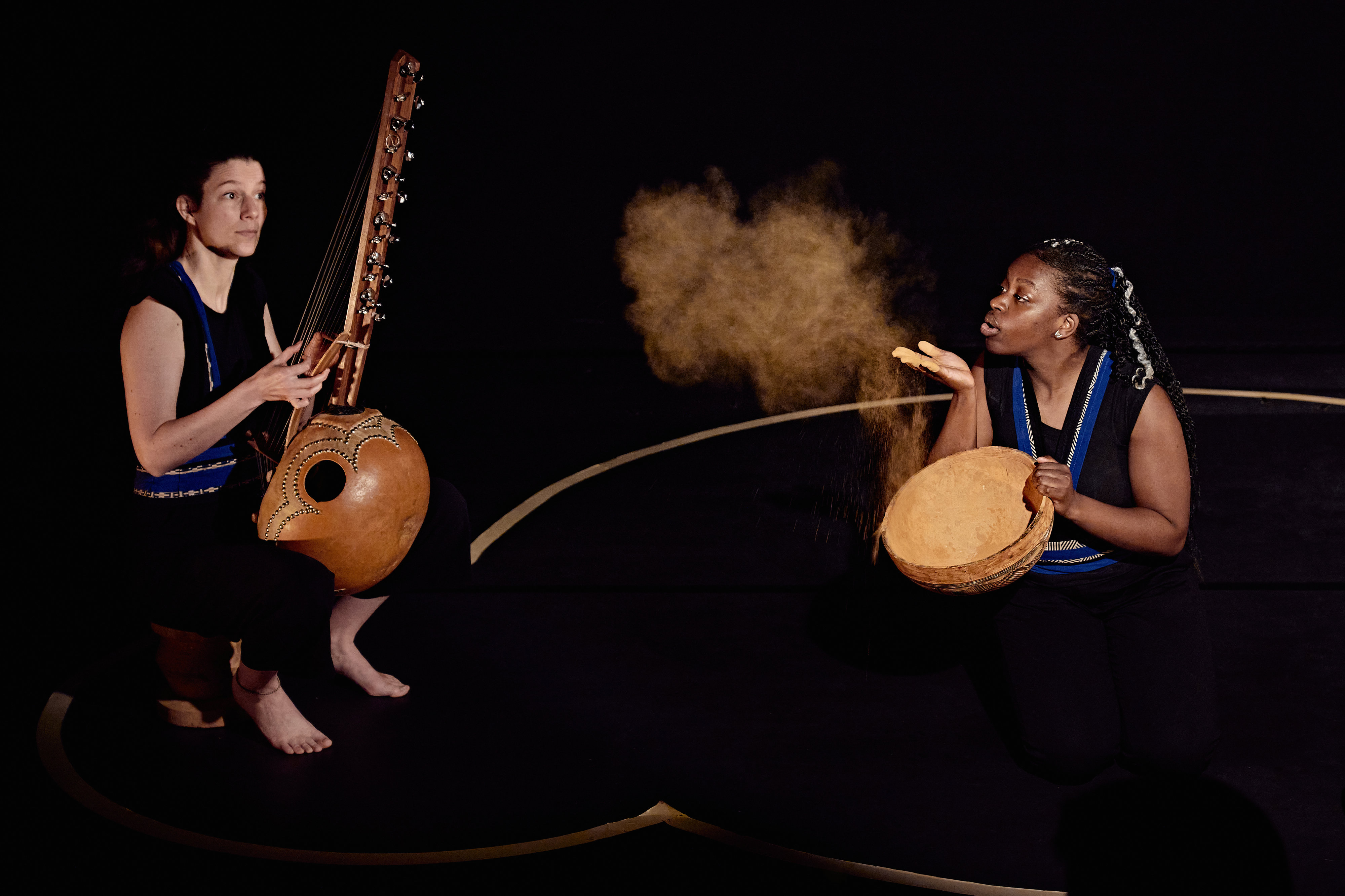 En se réappropriant ces gestes ancestraux, elle remet ses pas dans ceux des tout-petits qui jouent dans la terre. À ses côtés, une femme l’accompagne de sa voix au doux son du N’goni. Ensemble, elles ébauchent les traits qui égayeront plus tard les murs de leurs maisons. Et voyagent au plus près des racines de l’humanité.